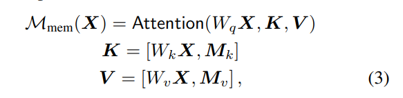 - 각 레이어에서 K=[WkX,Mk]K = [W_kX, M_k]와 V=[WvX,Mv]V = [W_vX, M_v]의 형태로 결합하여 Self-Attention을 수행하므로, 레이어마다 입력과 메모리가 결합된 새로운 형태의 관계를 학습하게 됩니다.