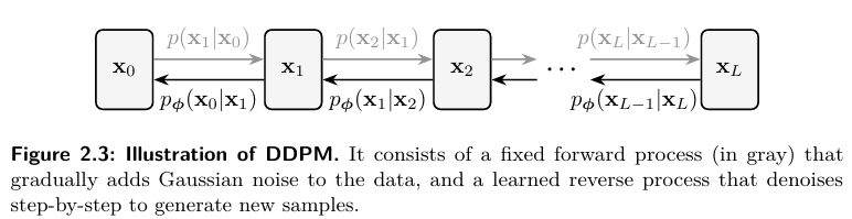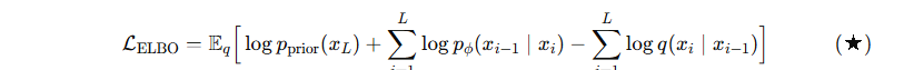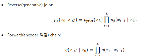 -p_phi(xo , x1:L) : prior ์์ ์์ํด์ reverse ๋ก ๋จ๊ณ๋ณ๋ก ๋ณต์ํด๊ฐ๋ ์ ์ฒด ๊ถค์