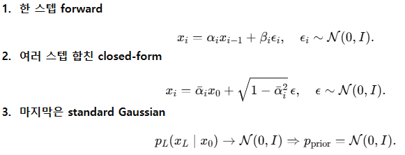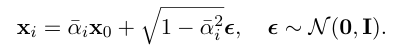 - ์ค๊ฐ step ์ ๋ชจ๋ ๊ฑฐ์น ํ์ ์์ด , X0 ( ์๋ณธ ์ด๋ฏธ์ง ) ๋ง ์์ผ๋ฉด ๋ฐ๋ก ์์์ i ์์ ์ noisy ๋ฒ์ ์ ์ํ๋ง ํ ์ ์๋ค.