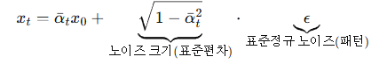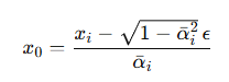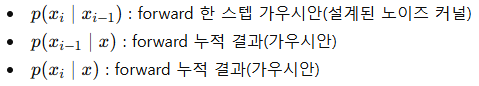 i ๋ฒ step ์ ๊ฐ์๋ ๋ xi ์์ ์๋ ๋ฐ์ดํฐ x0( ์๋ณธ ์ด๋ฏธ์ง) ๋ฅผ ( αi ) ๋งํผ ๋จ๊ธฐ๊ณ , ๋๋จธ์ง๋ฅผ ๊ฐ์ฐ์์ ๋ ธ์ด์ฆ๋ก ์ฑ์ด ์ํ