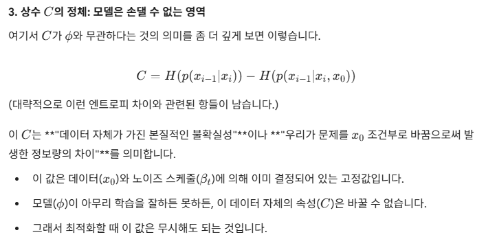 “์ฐ๋ฆฌ๊ฐ ์ง์ง ์ํ๋ ๊ฑด ์ต์ข ๋ถํฌ pฯ(x0)p_\phi(x_0)๋ฅผ ๋ฐ์ดํฐ์ ๋ง์ถ๋ ๊ฑด๋ฐ, ๊ทธ๊ฑธ ์ง์ ํ๊ธฐ ์ด๋ ต๋ค. ๋์ ์ ์ฒด ๊ณผ์ (joint) ๋ฅผ ๋ง์ถ๋ ๋ ๊ตฌ์กฐ์ ์ธ ๋ชฉํ๋ฅผ ์ต์ ํํ๋ฉด, ๊ทธ๊ฑด ์ต์ข ๊ฒฐ๊ณผ๋ฅผ ๋ง์ถ๋ ๋ชฉํ๋ณด๋ค ‘๋ ๊ฐํ ์กฐ๊ฑด’์ด๋ผ์ ๊ฒฐ๊ณผ์ ์ผ๋ก ์ต์ข ๋ถํฌ๋ ์ข์์ง๋ค.”