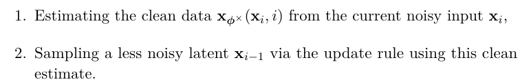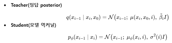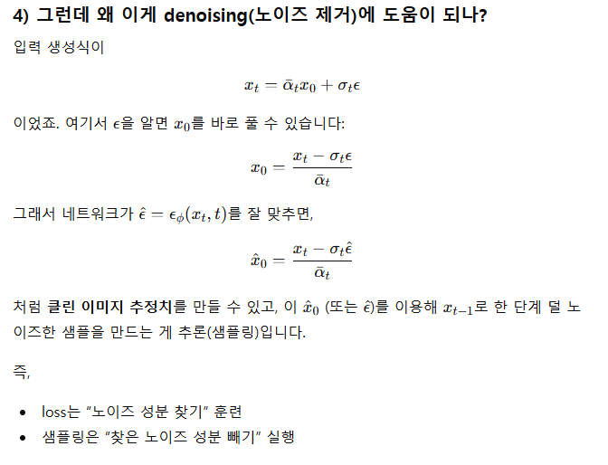 ํ์ต์์ time step i ๋ฅผ ๋๋ค ์ํํ๋ค -> ํ๋ฒ์ xo->xi ๋ก ์ ํํ๋ค -> xi ์ ๋ํด ์ญ์ผ๋ก ๋ค์ ๊นจ๋ํ๊ฒ ๋ง๋๋ ๋ฐฉํฅ์ ํ์ตํ๋ค.