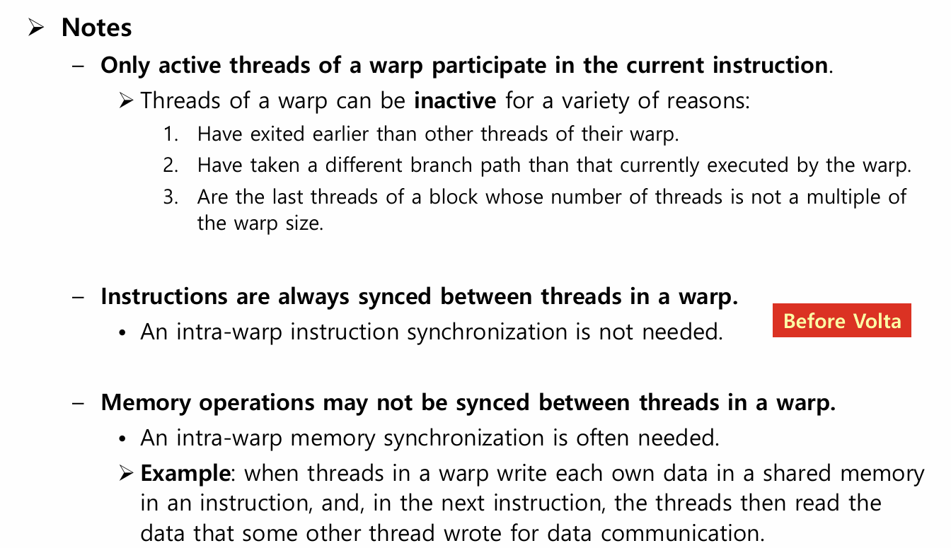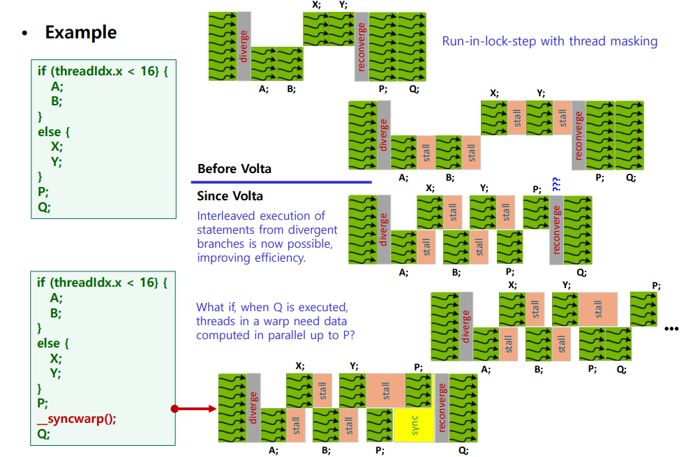 → 대신 lock-step이니까 reconverge 후 warp 내 동기화가 "암묵적으로" 보장됨