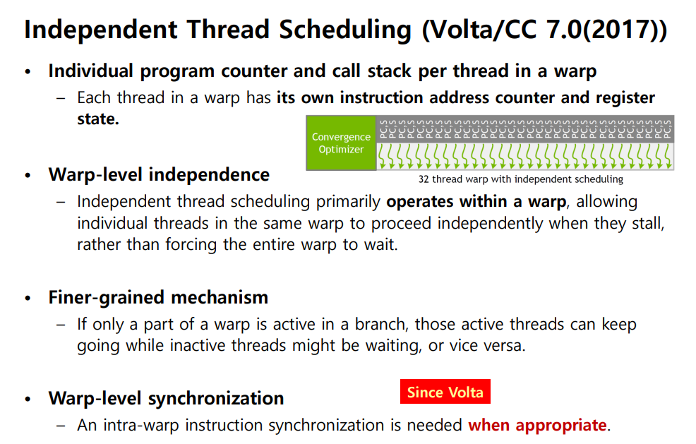 각 thread가 개별 PC + 개별 call stack을 갖게 됨. Divergent branch의 양쪽이 interleave되어 실행될 수 있어서 효율이 올라갔어.