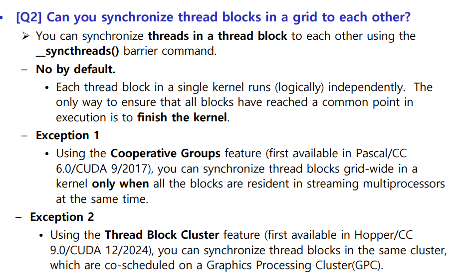 Q2: Grid 내 thread block들끼리 동기화할 수 있는가?