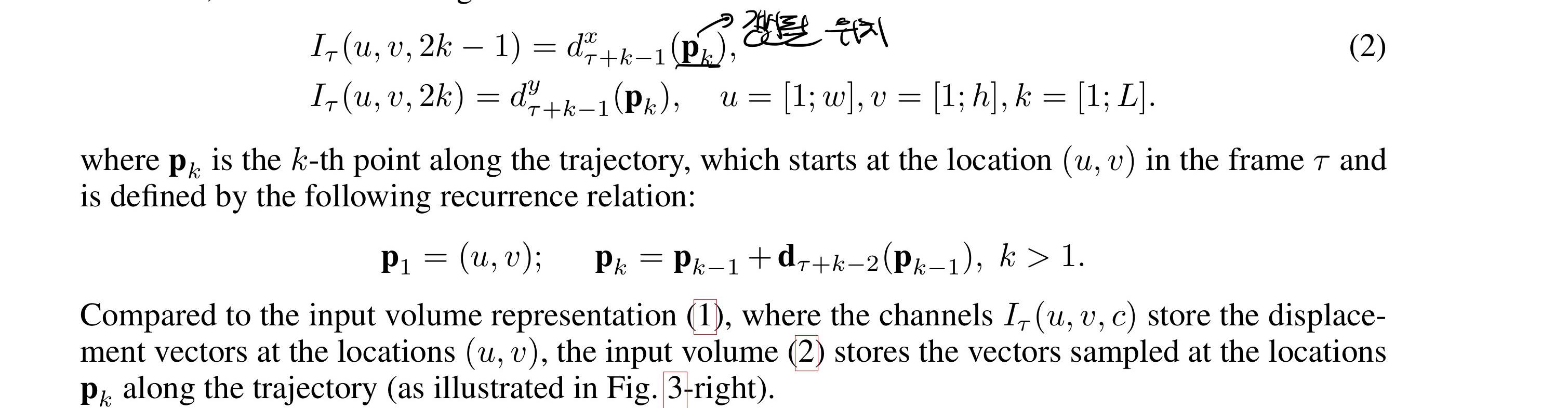 프레임 t 의 점 (u,v) 에서 displacement vet 를 d^t(u,v) 라고 하자. 이는 점 u,v 에서 다음 프레임 t+1 에서 물체에 대응되는 동일 점과의 displacement vector 이다. 물체를 추적하기 위함이고, 또한 동일한 픽셀을 대응시키면, 항상 변위는 0이기 때문에 암묵적으로 저런 의미를 내포하고 있다고 한다.