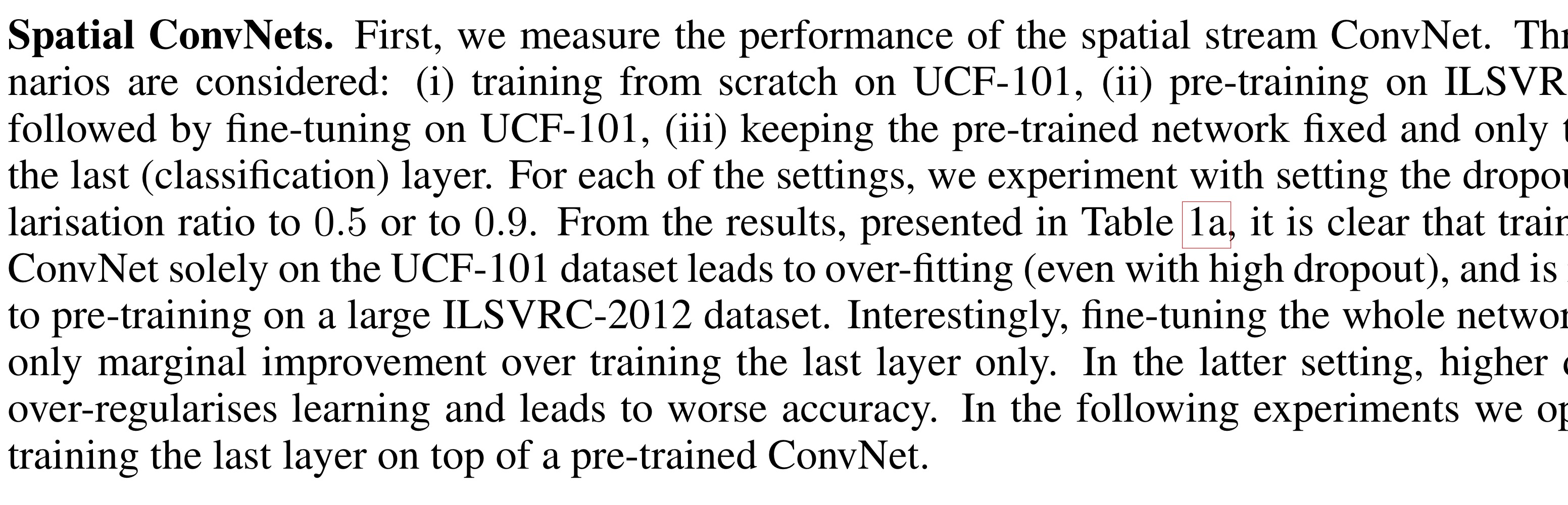이렇게 공간/시간으로 나누는 것으로부터 spatial stream은 이미지 넷과 같은 이미지에 대한 annotation 데이터로 사전 학습시킬 수 있는 장점을 얻을 수 있다.